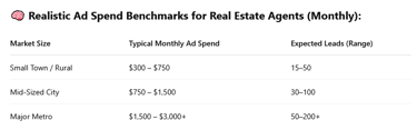 🔎 Rule of Thumb: Top agents typically invest 10–20% of gross commissions into marketing. For online ads alone, $500–$2,000/mo is common depending on how aggressive they want to be.